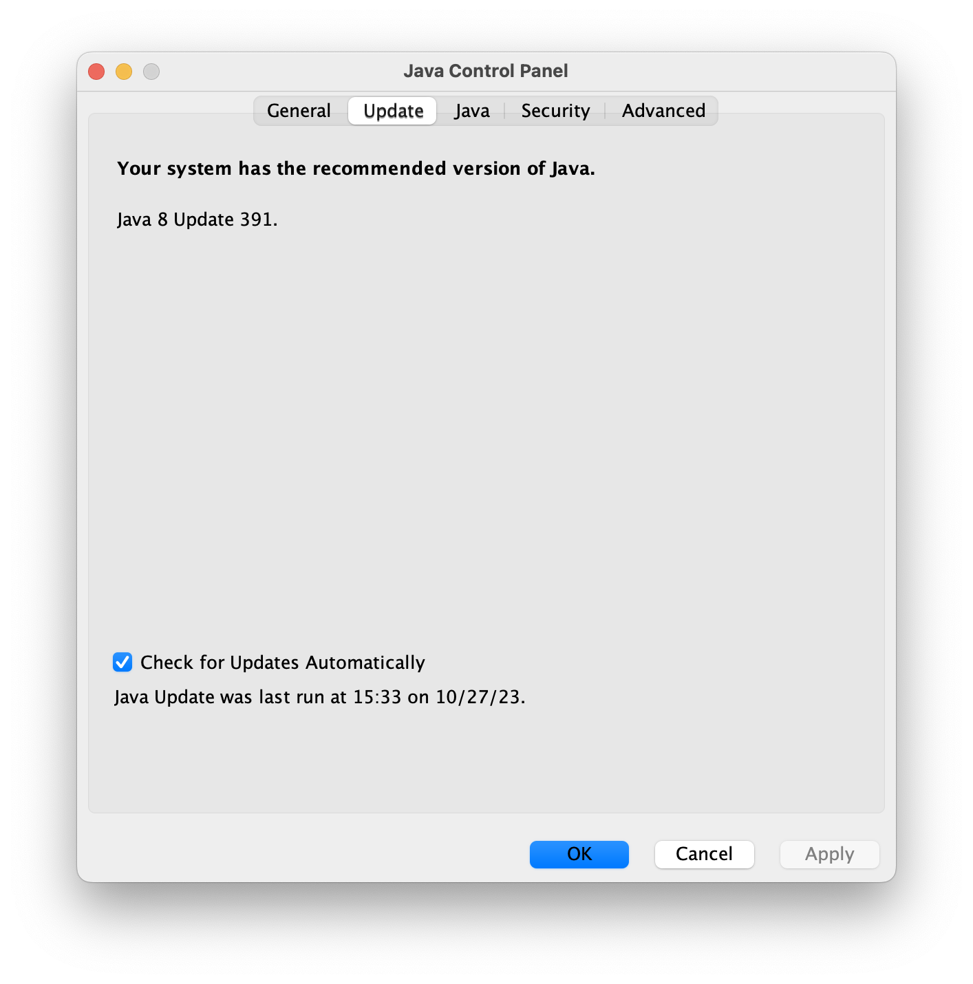$ '/Library/Internet Plug-Ins/JavaAppletPlugin.plugin/Contents/Home/bin/java' -version java version "1.8.0_391" Java(TM) SE Runtime Environment (build 1.8.0_391-b13) Java HotSpot(TM) 64-Bit Server VM (build 25.391-b13, mixed mode)